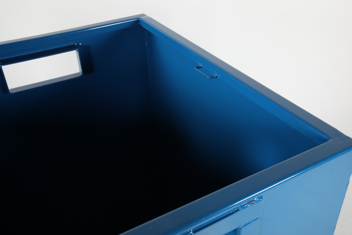 Bottentömmande container 700 L med 800 kg kapacitet. Pulverlackerad och staplingsbar modell med automatisk öppning och låsning. Lock finns som tillval (art.nr. 2511018189).