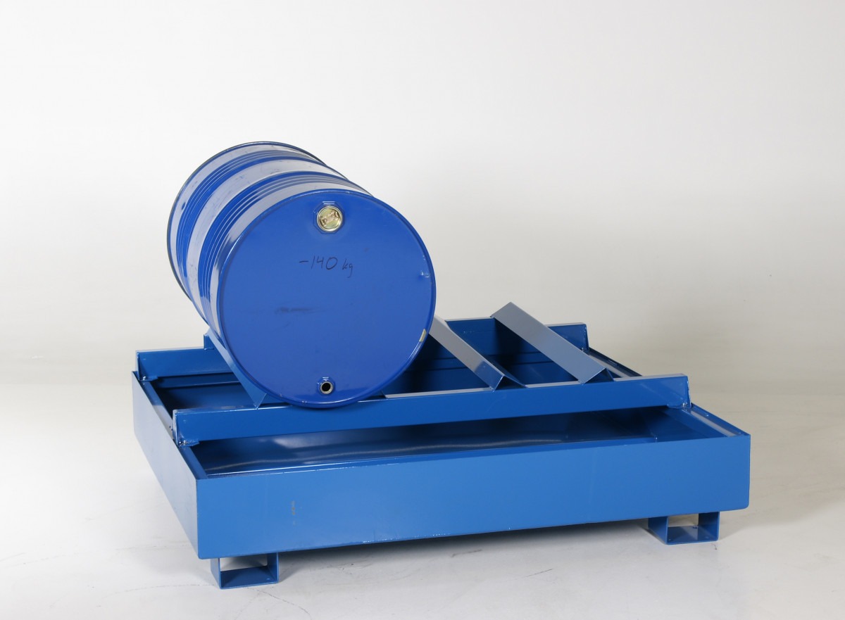 Fatpall för två liggande fat med integrerad spilluppsamling. Stabil konstruktion i stål, enkel att hantera med gaffeltruck, staplare eller handtruck. Perfekt för säker och effektiv fatförvaring.