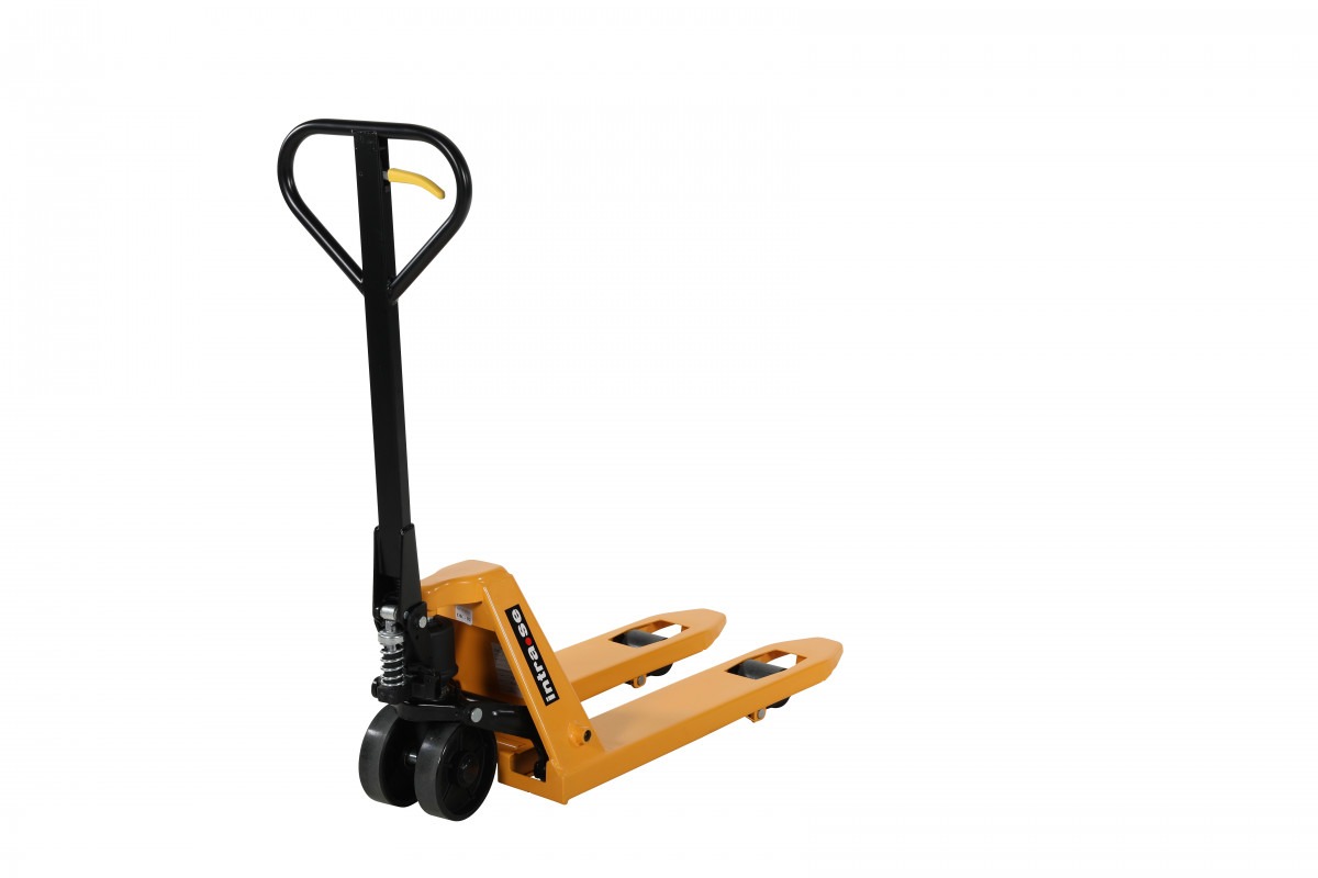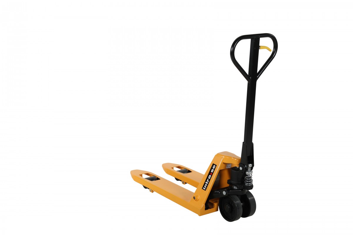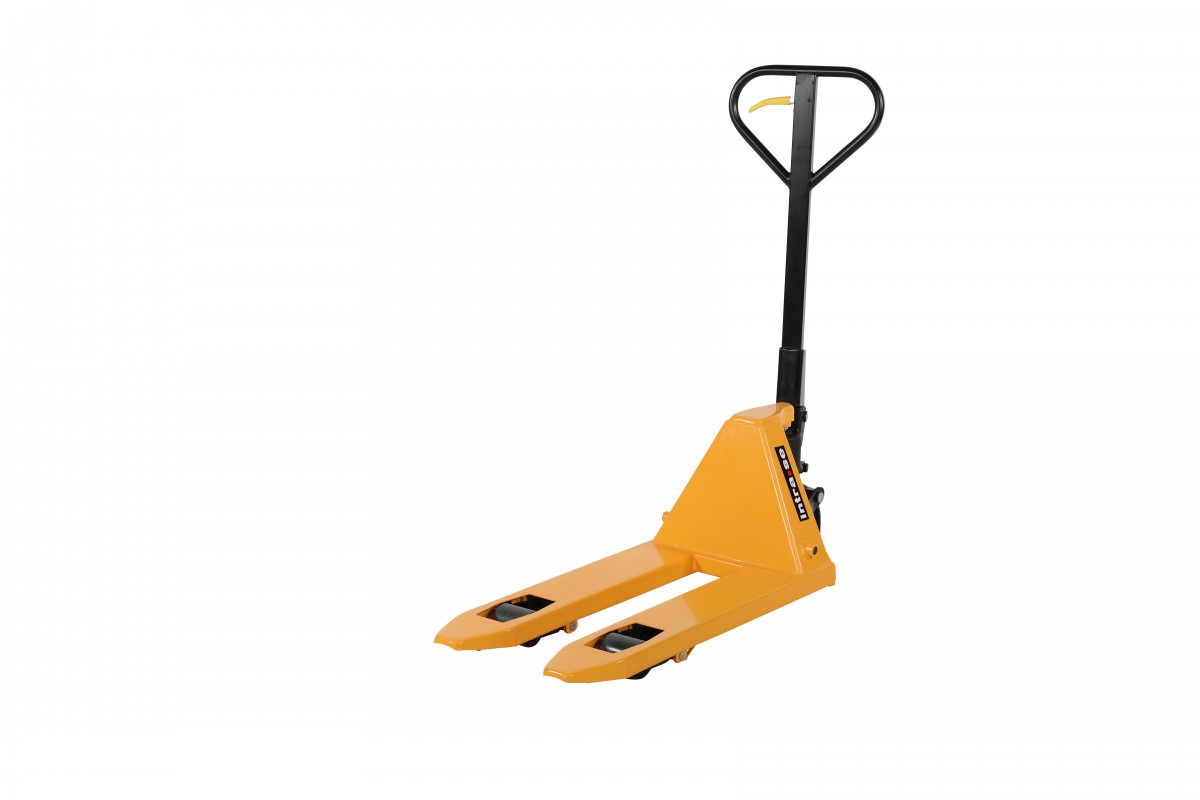 Palldragare 2500 kg – 450×800 mm, gul. Perfekt för mindre pallar och trånga utrymmen. Palldragaren är utrustad med singel/polyhjul för en smidig hantering.