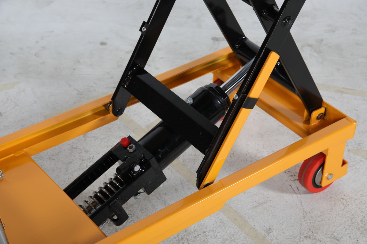 Bordet höjs med hjälp av en effektiv fotpump och sänks smidigt via ett praktiskt handreglage. Systemet är hydrauliskt och kräver cirka 32 pumpcykler för att nå maximal höjd – perfekt för upprepade lyft i det dagliga arbetet.