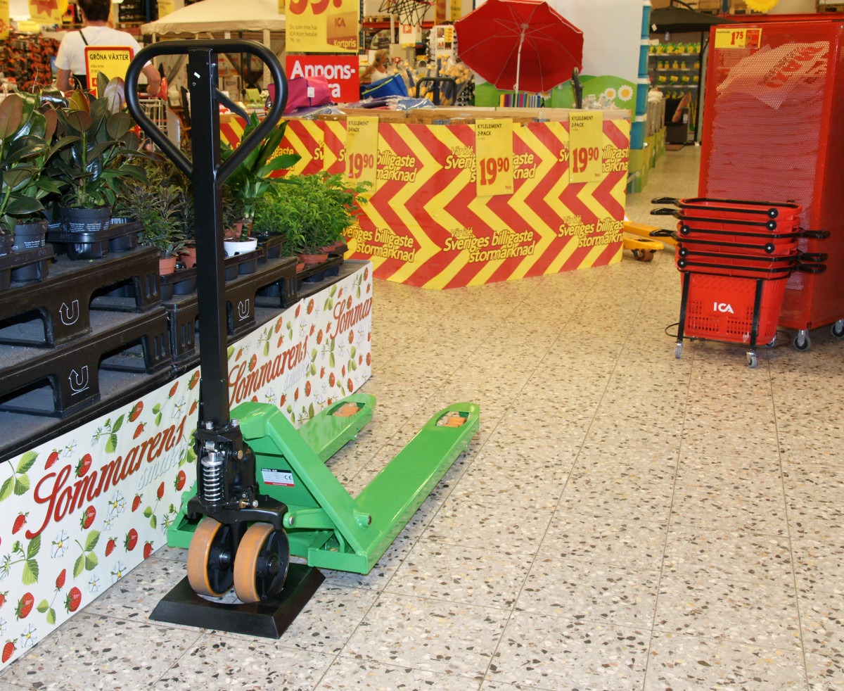 Pallstopp i gummi som håller pallvagnar stadigt på plats under transport eller vid förvaring. Perfekt för en säker och organiserad arbetsmiljö.