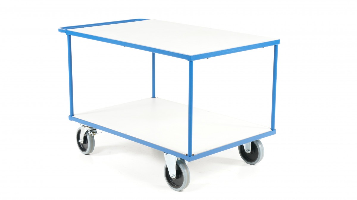 Plattformsvagn Heavy Duty 1200×800 mm med två kraftiga hyllor av laminerad spånskiva (18 mm). Robust och anpassad för tunga lyft i alla miljöer. Utrustad med stora 200 mm hjul som underlättar transport över ojämna underlag och trösklar.