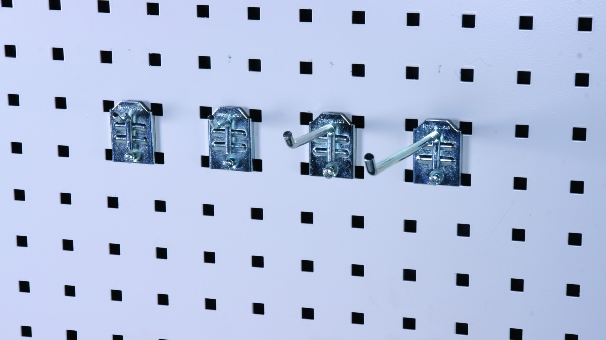 Dessa upphängningskrokar är designade för perforerade paneler och monteras smidigt genom att hakas i plåtens perforering och låses med stoppskruv. Den robusta metallkonstruktionen gör att krokarna sitter säkert även vid frekvent användning och klarar tyngre föremål.